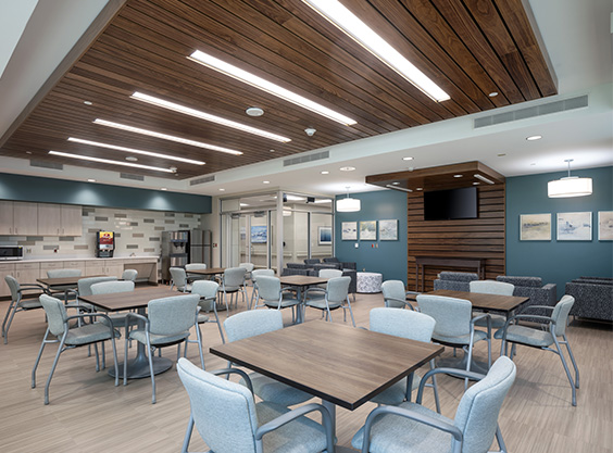 This behavioral and rehabilitation hospital is integrated into a larger medical center as a new addition, although the design still includes a new front door and distinct identity for each service line. One of the main design features is the outdoor areas designed as healing environments to improve the patient experience. The 81,800 SF facility offers inpatient, outpatient, and emergency mental health services for adolescents and adults, including 80 behavioral health beds (24 geriatric beds and 56 adult beds). The behavioral health patient rooms are semi-private, and the floor is divided into four nursing units with clinical support spaces. A dedicated dining and servery is provided for patient use and can be divided into separate areas for activities and events as needed. Two secure outdoor courtyards are also available for supervised patient therapy and activities. Additionally, the facility includes 20 acute rehabilitation inpatient beds and clinical support services.